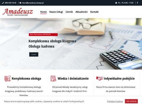 Opis firmy: Amadeusz Sp.j. ma siedzibę w Olsztynie. Firma powstała w 2000 roku. Od ponad dekady świadczymy usługi księgowe dla małych i średnich firm. Nasze biuro posiada wszelkie uprawnienia do usługowego prowadzenia ksiąg rachunkowych oraz obowiązkowe ubezpieczenie z tytułu prowadzonej działalności.